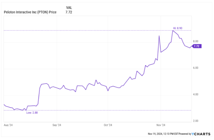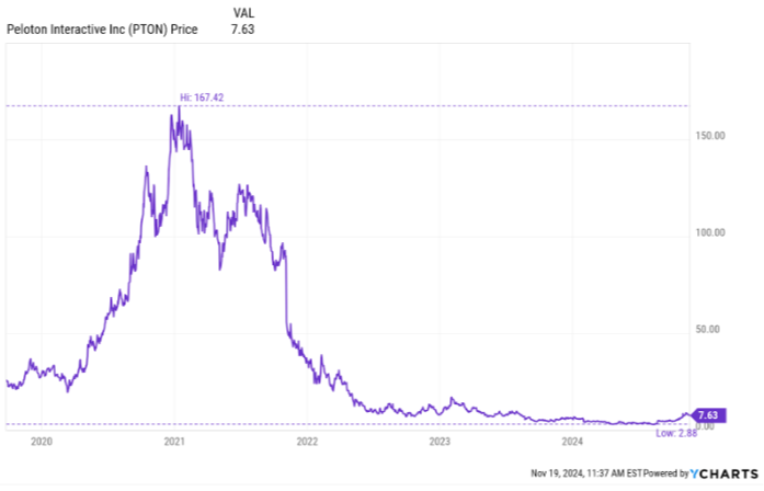 To further our point, let’s illustrate an example from the last few years. We’ll analyze the rise and fall (and potential rise again) of one of the pandemic-era favorites, Peloton Interactive, Inc. (PTON). Here is the price chart of PTON from late 2019 through a current date in November 2024: