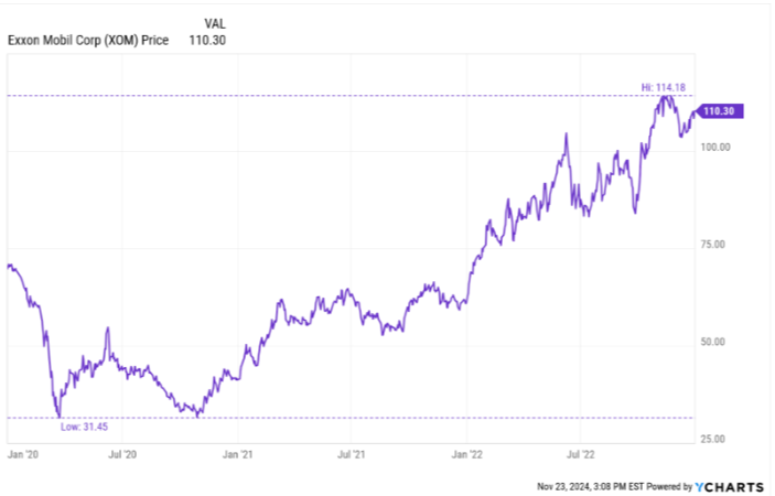 • Outcome: XOM shares bottomed out at $33.42 on November 3, 2020, and then took off over the next two years to reach just under $115/share in November of 2022, representing a gain of over 240%. The stock was up over 80% in 2022 alone, a year in which the broader S&P 500 index fell by over 18%. Shares rebounded as the global economy came back online more quickly than anticipated.