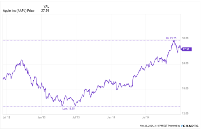 • Outcome: By November 14, 2014, the shares had doubled to $29.75. While the concerns over lack of ongoing innovation may have been well founded, Tim Cook, the new CEO, had just begun the era of borrowing at low rates to buy back company shares. From 2013 through September 2024, AAPL has spent roughly 5x the amount on share buybacks compared to what they’ve spent on capital expenditures. In total, the company has purchased roughly 40% of shares outstanding over the last eleven years.