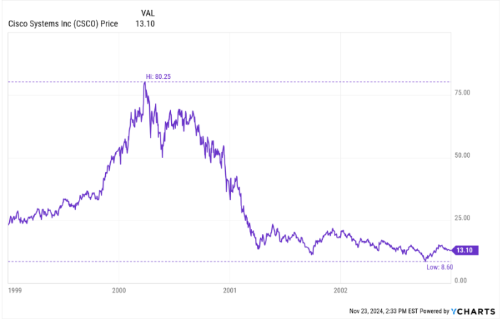 • Outcome: CSCO grew revenue at “only” 18% in fiscal year 2001. The stock collapsed by close to 90% to $8.60 on October 8, 2002. The share price today (11/20/24) is $56.90, still ~ 30% below the peak 24 years ago.