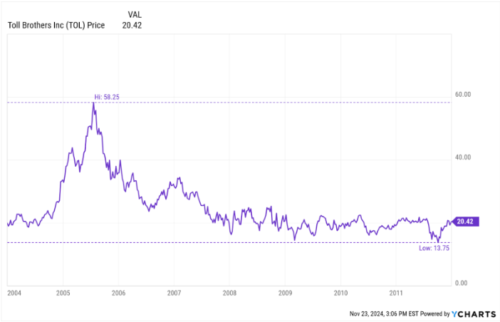 • Outcome: Signs of trouble began to emerge in late 2005/early 2006. A Gallup survey in May 2006 showed that 71% of consumers believed the housing bubble would collapse in the next year, however, according to reports most “experts” believed there would be no bubble bursting on a national basis. At that time, TOL had already been cut in half dropping to $28/share, on its way to a low of $13.75 on October 3, 2011.