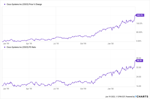 That is a direct quote from someone who lived through a massive bubble and after the fact basically told investors they were crazy to buy his stock at 10x price-to-sales. NVDA is currently four times more expensive than Sun Microsystems was at its peak. While we would not expect the same degree of humility from Nvidia’s CEO, Jensen Huang, if his company’s shares don’t live up to the current level of excitement, we do believe it is instructive to recall historical periods that seem to rhyme with today’s environment. Another case study from the 1990s that we believe is worth reviewing is that of Cisco Systems, Inc. (CSCO). There was building excitement for CSCO shares in the late 90s as a leading provider of networking equipment in a rapidly changing world in which everything would soon be connected to the internet. Here is a chart for CSCO from January 1999 to March 2000: