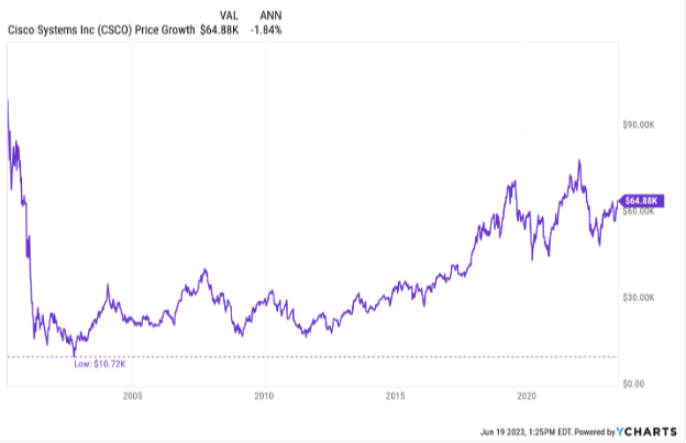 As you can see, not including dividends paid, the $100k investment in CSCO lost close to 90% of its value by October 2002 and, if held for the last 22 years + would still be worth only $64k.