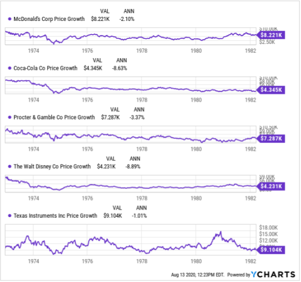 The chart below shows a hypothetical investment of $10,000 in five of the Nifty Fifty stocks from December 1972 to March of 1982.