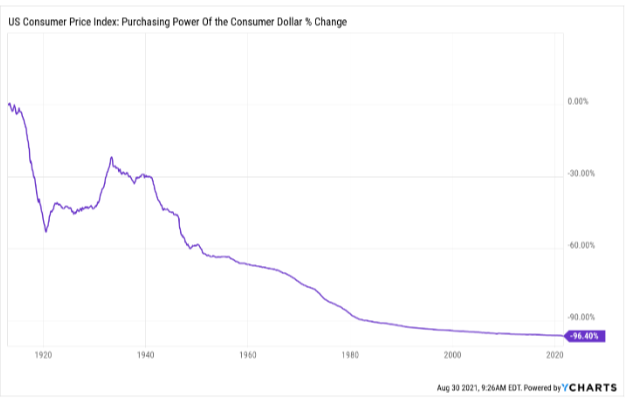 The chart above shows how the dollar has lost more than 96% of its purchasing power since the Federal Reserve was created in 1913. Most consumers understand that prices for goods and services generally increase over time and can point to several clear examples over the last 18 months such as buying a car or items in the grocery store aisles. With that said, the money illusion is so strong that even professional economists and statisticians often fail to understand the full impact in real time.