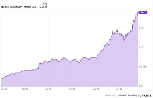 The second chart shows the increase in Nvidia (NVDA) stock over the same period. On January 1, 2023, NVDA was valued at $360 billion. Today, it is roughly $3,100 billion or $3.1 trillion which represents an increase of over 750%. The $2.7 trillion increase in value is roughly the size of France’s economy ($3.13 trillion).