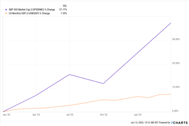 The final chart compares the percentage growth in the total dollar value of the S&P 500 vs the percentage growth in the US economy. The economy began 2023 valued at $26.47 trillion. Today, it is roughly $28.42 trillion, representing nominal growth of 7.35%. The S&P 500 total dollar value growth has increased by 37.17% over the same period.