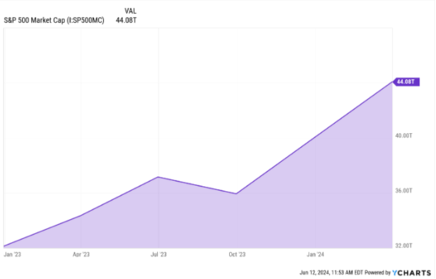 The first chart shows the growth in total dollar value for all stocks in the S&P 500 index since the beginning of 2023. The total value of S&P 500 stocks on 1/1/2023 was $32.13 trillion. The current value is just over $44 trillion dollars, meaning that the S&P 500 has added roughly $12 trillion dollars of value in the last 17 ½ months. To put that in context, the entire US economy is $28.4 trillion, and the entire European Union is ~ $15 trillion.